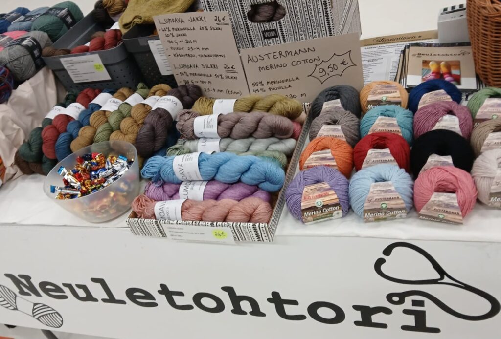 Huhtikuu on ollut työntäyteinen. Muiden hommien ohessa on juhlittu Neuletohtorin 1-vuotissynttärit ja eilinen päivä vierähti Haapaveden Elinvoima-messuilla. Olikin pitkästä aikaa mukava päästä messuilemaan. Väkeä oli paikalla runsaasti ja mukavia kohtaamisia tuli paljon. Ainoastaan aamulla kuumotti lähteä ajamaan kesärenkailla, kun yön aikana oli satanut lunta ja lämpömittari oli pakkasen puolella… No, maltti oli valttia ja turvallisesti pääsin perille.
